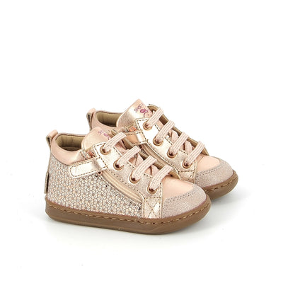 Basket OPALE de BELLAMY en cuir imprimé rose et argent, semelle amovible, fermeture par trois pattes velcro pour un style affirmé, semelle blanche plate cousu latéralement.