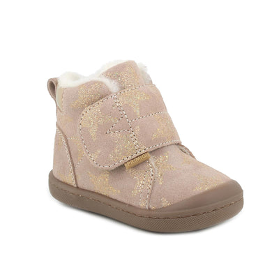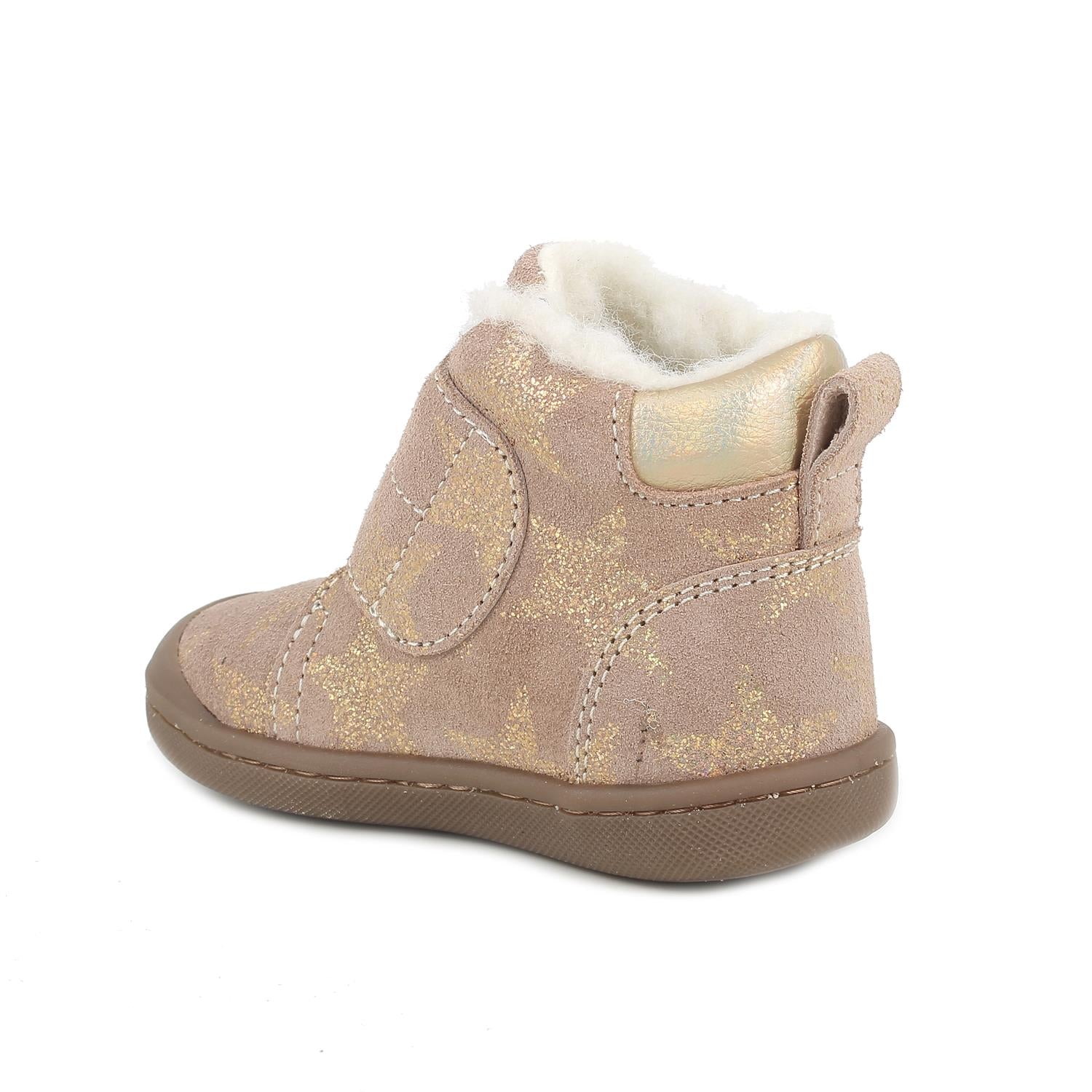 Bottillon DRAF de BELLAMY en croute velours bleu marine imprimée à motif doré, fermeture par scratch, contrefort arrière matelassé, semelle souple avec protection du bout avant.